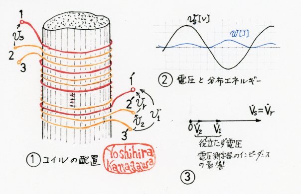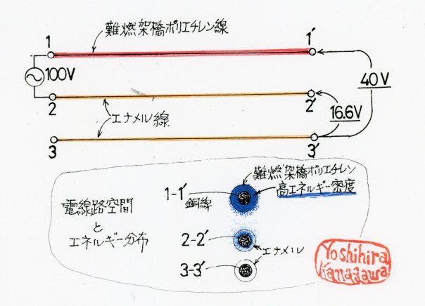 三本の内 1-1’の絶縁電線が特別の、難燃架橋ポリエチレン線で他の二本のエナメル線に比べて高誘電率の絶縁電線である。➁電圧と分布エネルギー その電源電圧Vs[V]に対するエネルギー分布密度w[J]の脈動波形の大きさに差が生じる。その訳がどの様な意味であるか❓ただし、この波形は測定できない。